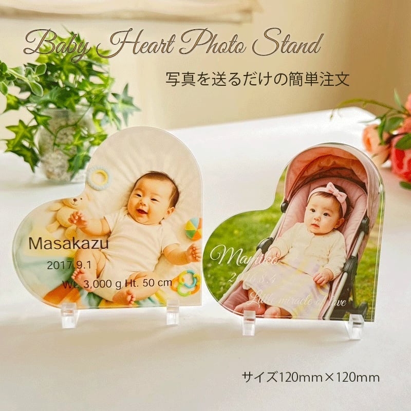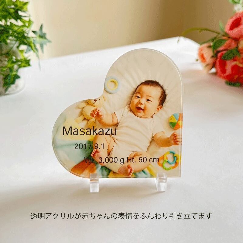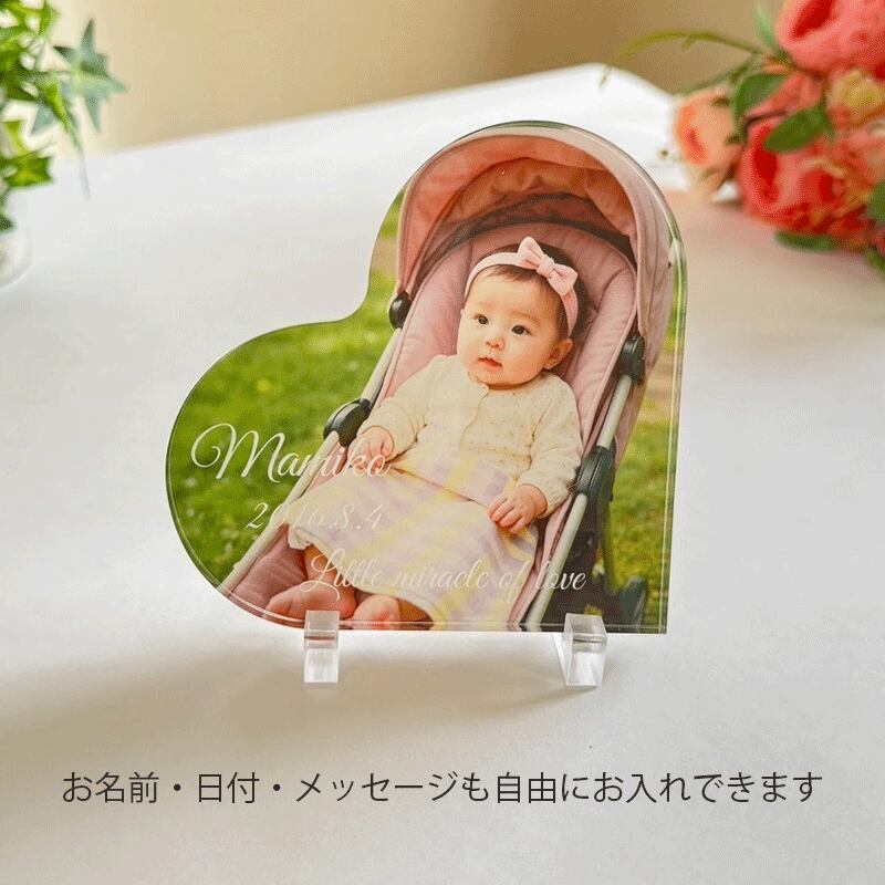 新しい命の誕生を祝う特別な贈り物に、赤ちゃんのお写真をハート型にくり抜いてデザインしたオーダーメイドギフトです。かわいらしいフォルムと上品な仕上がりは、出産祝い・誕生記念のプレゼントとしてご家族やご友人に大変喜ばれます。